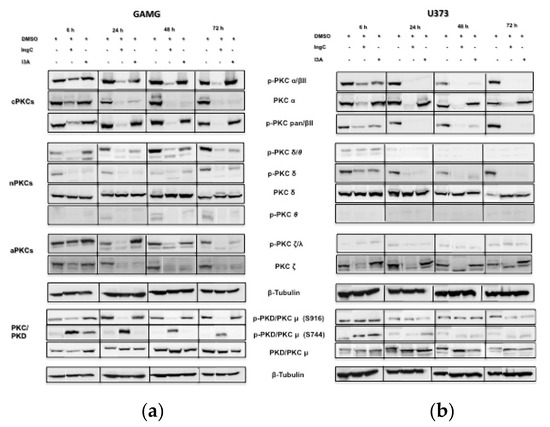 Multiple antitumor effects of diterpenes have been related to the direct modulation of PKCs, important proteins that are involved in cellular signal pathways [31]. We evaluated the PKC isotypes (conventional PKCs (cPKCs) to investigate the possible role of IngC in PKC signaling pathway: PKCα, p-PKCα/βII, p-PKCpanβII, novel PKCs (nPKCs): PKCδ, p-PKCδ, p-PKCδ/θ, p-PKCθ, and atypical PKCs (aPKCs): p-PKCζ/λ, PKCζ as well as PKD1/PKCμ, p-PKC PKDμ (Ser916), and p-PKC PKDμ (Ser744)) activation profile using immunoblotting (Figure 6). We also compared the IngC involvement in PKC activity with the known modulator I3A. IngC markedly downregulated the phosphorylation of most PKC isotypes (PKCalpha/beta, PKCpan/betaII, and PKC/PKDμ (Ser916)) as compared to I3A in GAMG cell line (Figure 6a). Moreover, similarly to IngC, I3A also decrease PKCδ/θ, PKCδ activation levels and the total expression of PKCα over time. Although less intensely, I3A also decreased the phosphorylation of PKCζ/λ and total levels of PKCζ over time (Figure 6a). In contrast to the general downregulation of PKC isoforms, the PKC/PKDμ (Ser744) isotype had transient phosphorilation by either IngC or I3A. PKC/PKDμ (Ser744) phosphorylation peaked at 6h with IngC and decreased over time, whereas I3A led to a short-lived peak, weaning off before 24 h (Figure 6a).