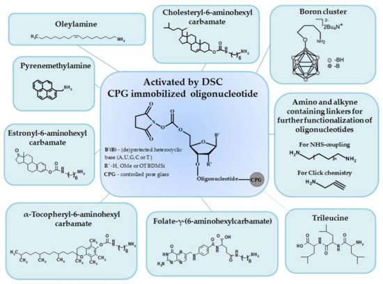 Two simple homobifunctional reagents have been routinely used in organic and bioorganic chemistry to activate the amino and hydroxyl moieties, 1,1′-carbonyldiimidazole (CDI) and N,N′-disuccinimidyl carbonate (DSC) [21]. The reactivity of the N-succinimidyl carbonate formed during DSC activation is much higher than that of imidazole carbamate, the active species in CDI activation. The carbamate linkage formed after the coupling of succinimidyl carbonate to amine-containing ligands is chemically stable [22]. In the context of nucleic acid chemistry, the activation of 5′-hydroxyl by CDI for the synthesis of 5′-aminoalkyl oligodeoxynucleotides was described earlier [23,24], but no examples of using DSC have been reported to date.