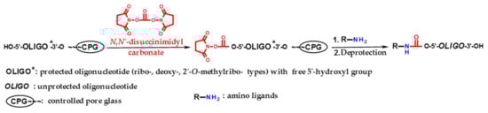 In the present work, we have proposed and validated the novel method of solid-phase synthesis of oligonucleotide conjugates with different amino ligands. The approach is based on the activation of the free 5′-hydroxyl of protected polymer-bound oligonucleotide obtained by an automated oligonucleotide synthesis with N,N′-disuccinimidyl carbonate (DSC), followed by the interaction with amino-containing ligands and standard deprotection steps (Scheme 1).