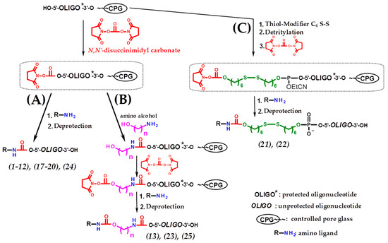 For example, we employed this approach to conjugate oligonucleotides with different types of amino ligands which facilitate the cell penetration, such as lipophilic molecules (cholesterol, estrone, oleylamine, α-tocopherol, folic acid) and short peptides (trileucine) (Table 1, Scheme 3A, (1–7), (18–20)). Of note, the developed DSC-based solid-phase approach is especially convenient for the synthesis of oligonucleotide conjugates bearing highly hydrophobic residues since there is no need to seek the solvents that accommodate both extreme lipophiles and hydrophilic oligonucleotides.