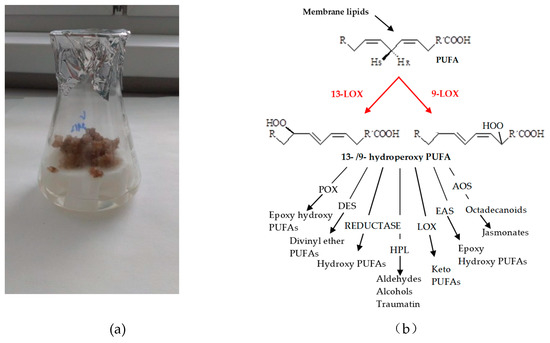 (a) Opium poppy (Papaver somniferum L.) callus culture; (b) The lipoxygenase-catalyzed reaction of polyunsaturated fatty acid (PUFA) into 13-/9-hydroperoxide of PUFA and the scheme of lipoxygenase pathway branches. LOX – lipoxygenase, AOS – allene oxide synthase, DES – divinyl ether synthase, HPL – hydroperoxide lyase, PXG – peroxygenase, EAS – epoxy alcohol synthase.