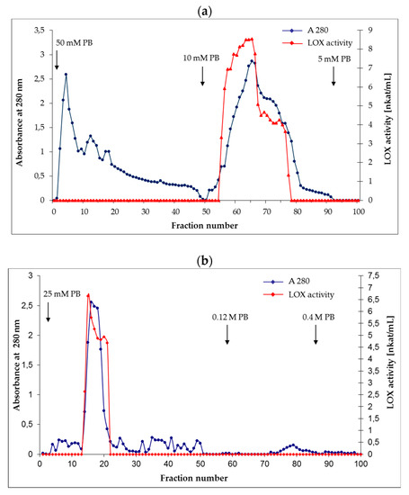 Active fractions were pooled, freeze-dried and dissolved in 3 mL of 25 mM potassium phosphate buffer (pH 6.0) and applied to a HA Ultrogel® column (Ø 2 × 15 cm, Sigma-Aldrich, St. Louis, USA) equilibrated with the same buffer and eluted stepwise with 0,025 M, 0.12 M, and 0.4 M potassium phosphate buffer (pH 6.0) at the flow rate of 1 mL/min. Fractions of 2 mL were collected. The eluate was monitored at 280 nm. Each fraction was assayed for LOX activity. Fractions with LOX activity were pooled and concentrated using 50 kDa membrane filter Amicon Ultra Centrifugal Filters Ultracel®-50K (Milipore, USA) using centrifugation at 15,000× g for 30 min and at 4 °C. The LOX enzyme preparation was then stored at −20 °C until further analysis.