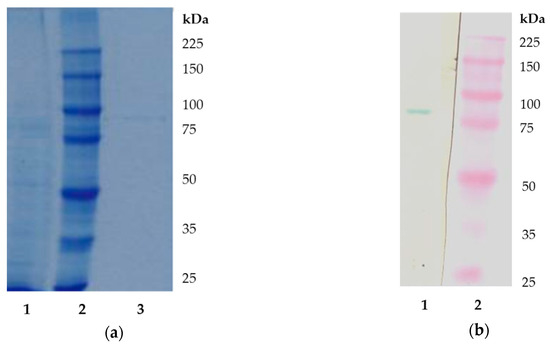 - Laemmli, U.K. Cleavage of structural proteins during the assembly of the head of bacteriophage T4. Nature 1970, 227, 680–685. [Google Scholar] [CrossRef]