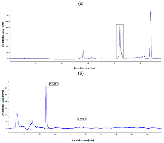 HPLC analysis of incubation products of purified LOX enzyme and linoleic (LA) substrate. (a) Chromatographic profile of the preparative reversed-phase high-performance liquid chromatography (RP-HPLC). The marked peak represents an isolated fraction (absorbing at 234 nm) used for the subsequent NP-HPLC separation of hydroxy-octadecadienoic acids (HODEs). The eluate of the isolated fraction was collected in the interval of 21 min. (b) Chromatographic profile of the NP-HPLC separation of 13-/9-HODE products. The elution times of 13-HODE and 9-HODE were 12 min and 23.5 min, respectively. The unidentified peaks in NP-HPLC profile could be structurally related compounds such as fatty acids originating from the plant matrix (based on their similar elution and UV absorbance properties).