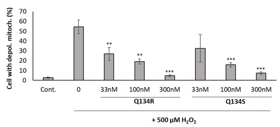 Mitochondrial membrane depolarization assay. Treatment with the synthesized enantiomers reversed the mitochondrial membrane potential changes caused by oxidative stress. Y axis represents the percentage of cells with depolarized mitochondria. ** p < 0.01; *** p < 0.001 (pairwise comparison of Q134R or Q134S treatment to only H2O2 treated cells; Student’s t-test).