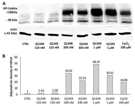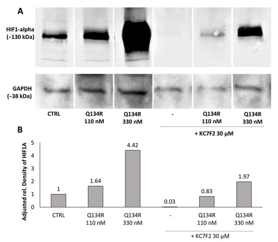 Consequently, we tested whether Q134R was able to restore HIF1A expression in cells depleted of HIF1A with KC7F2 (30 µM, 24 h). Western blot analysis showed (Figure 5) that Q134R was partially able to restore HIF1A, but only at the higher 330 nM concentration. The HIF1A level in cells treated with 110 nM Q134R was below control.