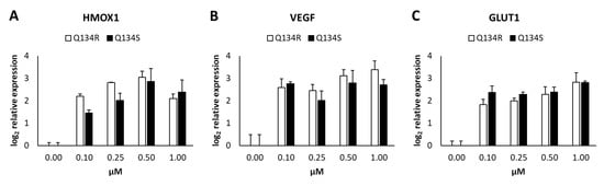 Quantitative real time PCR analysis of HIF1 regulated genes following Q134R and Q134S treatment in vitro. (A) HMOX1 gene expression, (B) VEGF gene expression, (C) GLUT1 gene expression.