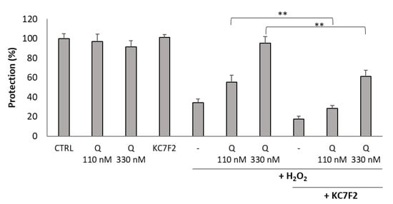 Inhibition of HIF1A translation abolished the cytoprotective activity of Q134R. U251 MG cells were pretreated with KC7F2 (30 µM, 24 h) to block HIF1A translation. Then, cells were treated with Q134R (Q 110 or 330 nM) and H2O2 (500 µM). ** p < 0.01 (Student’s t-test).