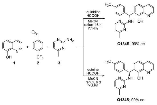 As previously reported, a formic acid-mediated three-component assembly of 8HQ (1), 4-(trifluoromethyl)benzaldehyde (2), and 4-methylpyrimidin-2-amine (3) gave access to racemic Q134 []. In order to prepare pure enantiomers, cinchona alkaloids were firstly tested in the Betti-3CR, giving no conversion. However, excellent enantiomer ratios were obtained when quinidine or quinine were employed in the presence of formic acid (Scheme 1). It should be noted, that nearly a stoichiometric amount of catalyst and acid was applied, however, these reaction conditions were determined to be optimal for industrial synthesis, therefore further optimization was not performed. The chirality transfer might be explained via the formation of an ion pair between the catalyst and 1, generating a chiral transition complex, which can react with the imine formed in situ. The absolute configuration of each enantiomer was supported by vibrational circular dichroism (VCD) and IR measurements. Moreover, the well-established protocol allowed the synthesis of Q134R and Q134S in an asymmetric fashion on a multigram scale [].