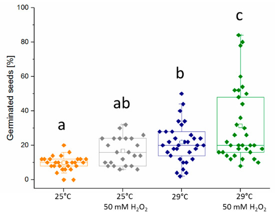 Both temperature and hydrogen peroxide promote eggplant germination. The experiment was conducted in eight biological replicates, each consisting of three independent sets of 50 seeds at 72 HAI. Letters indicate statistically significant differences (Kruskal–Wallis), and open squares represents average of all replicates.