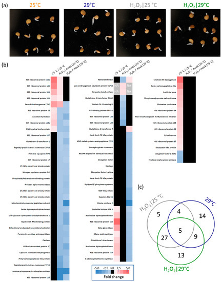 Effects of temperature and hydrogen peroxide treatment on the proteome of germinating eggplant seeds. (a) Representative set of germinated seeds selected for a biological replicate 72 HAI. (b) Differentially abundant proteins identified in response to hydrogen peroxide or temperature, with the UniProt-recommended protein name based on the closest orthologue in model plant Arabidopsis. Fold change represents the average of at least three replicates. See Supplementary Materials for full details including the original protein annotations. (c) Venn diagram representation of the overlap between temperature and hydrogen peroxide-responsive proteins.