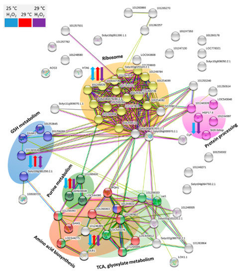 Visualization of putative interactions and processes mediated by the identified differentially abundant proteins. The network was constructed by String 11.0 [15], which employed an orthologous analysis of Solanum tuberosum proteins. Highlighted clusters revealed functional enrichments in the network based on biological process (gene ontology, GO) and metabolomic pathways (KEGG: Kyoto Encyclopedia of Genes and Genomes). In total, five distinct clusters are visible, including protein biosynthesis processes (ribosome and protein processing), glutathione metabolism, purine metabolism, and overlapping processes in primary and energetic metabolism (amino acid biosynthesis, TCA, and glyoxylate metabolism). Blue, red and purple arrows indicate observed changes in protein abundances for seeds incubated with hydrogen peroxide at 25 °C, seeds incubated at 29 °C, and seeds incubated with hydrogen peroxide at 29 °C, respectively.