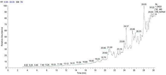 The TIC chromatogram of H. sabdariffa using GC–MS. RT—retention Time; SM—signal in method; NL—noise level.