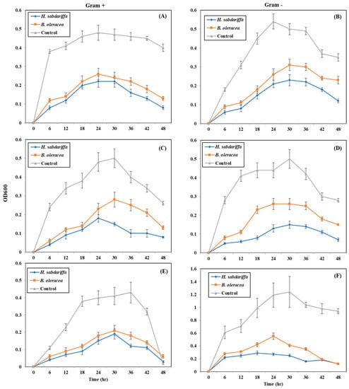 Quantitative inhibition of Gram-positive and Gram-negative bacteria by MIC of H. sabdariffa crude phenolic rich extract. (A) S. aureus; (B) E. coli; (C) St. pyogenes; (D) K. pneumonia; (E) L. monocytogenes; (F) P. aeruginosa.
