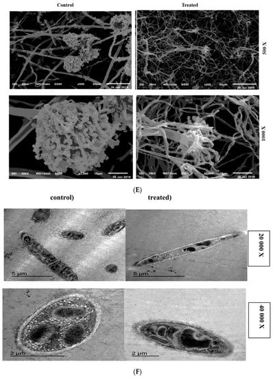 TEM (JEOL JEM -2100, JAPAN) at EM Unit, Mansoura University, Egypt was used to evaluate ultrastructural changes of tested microorganisms as described in [14,57].