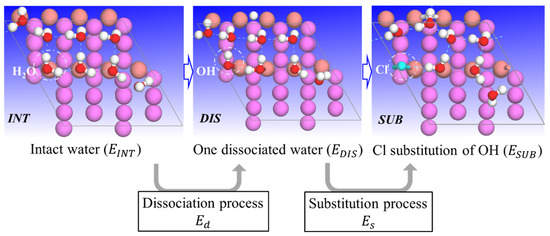 The energy needed for the dissociation () of one H2O molecule into OH and H and for substitution () of one OH by one Cl was calculated by Equations (2) and (3) [36], respectively: