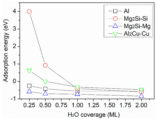 Adsorption energy of H2O on Al, Mg2Si–Si, Mg2Si–Mg, and Al2Cu–Cu surfaces versus H2O coverage.