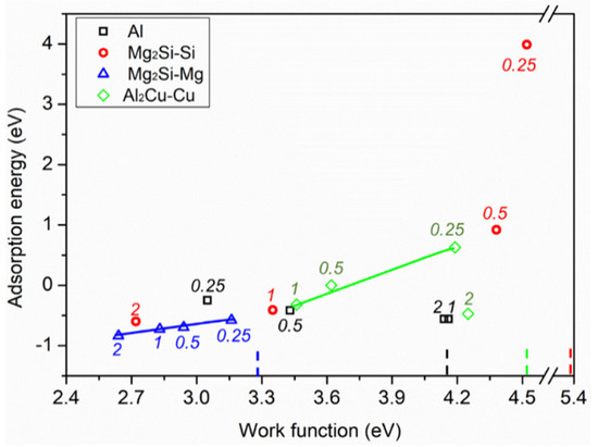 In this work, Al, Mg2Si, and Al2Cu crystals were considered. Aluminum has a cubic structure with a = 4.05 Å [31], and Mg2Si is cubic with a = 6.35 Å, while Al2Cu is tetragonal with a = 6.06 Å, c = 4.87 Å [32]. For Al, its (111) surface was studied. The Mg2Si(111) surface with Si and Mg terminations was selected, as these two terminations show rather different work function values. In addition, the Al2Cu(110)–Cu was selected for comparison. Note that vacuum was set to be at least as high as the thickness of the slab layers, and all atom positions were allowed to be optimized (details of the model construction can be found in [10,33]). In the following, Al(111), Mg2Si(111)–Si, Mg2Si(111)–Mg, and Al2Cu(110)–Cu will be simply written as Al, Mg2Si–Si, Mg2Si–Mg and Al2Cu–Cu, respectively.