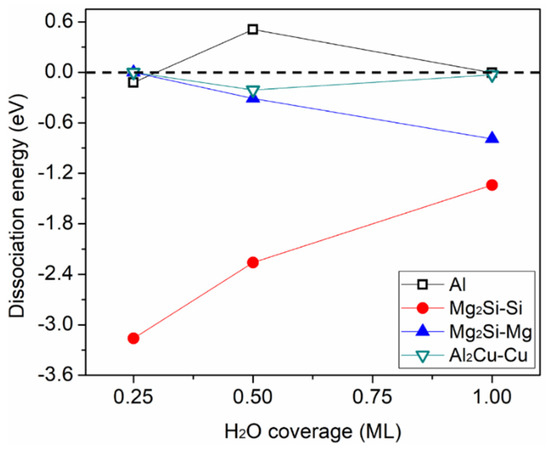 The results showed that intact H2O adsorption on all four surfaces was exothermic when the H2O coverage increased to 1 ML (Figure 3), and an enhanced H-bonding within the H2O ad-layer was observed. The introduction of one OH in the intact H2O ad-layer showed that H2O dissociation was not favorable on Al and Al2Cu–Cu under the examined calculation conditions, whereas H2O had a strong tendency to dissociate on Mg2Si–Si and Mg2Si–Mg (Figure 5). By calculating the reaction free energy of H2O dissociation on the Al surface based on the methodology proposed by J.K. Nørskov [55], we found that H2O dissociation was favorable at a positive electrode potential (to be published elsewhere) [56]. In the future, the VdW corrections should also be taken into account because of the moderate modification of the adsorption energy produced by the VdW force, especially for energies around 0.1 eV [57].