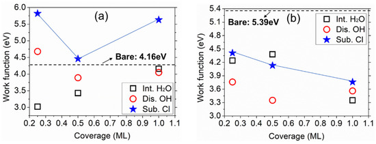 The adsorption of pure intact water reduced the work function, compared to the value 4.16 eV for bare Al, as indicated by the dashed line in Figure 6a. This was due to the slightly upward pointing of the water molecules (Figure S1), which formed an upward dipole. In comparison with intact water adsorption, dissociation most likely increased the work function, except at coverage of 1 ML. This has been observed also on other metal surfaces, with OH being an electron acceptor [24,38,47]. Introduction of Cl raised the Al work function even further, as a result of a significant change of water molecules’ orientation upon adsorption of 1 ML of aqueous ad-layer, as seen in Figure S1 and Figure 7a.