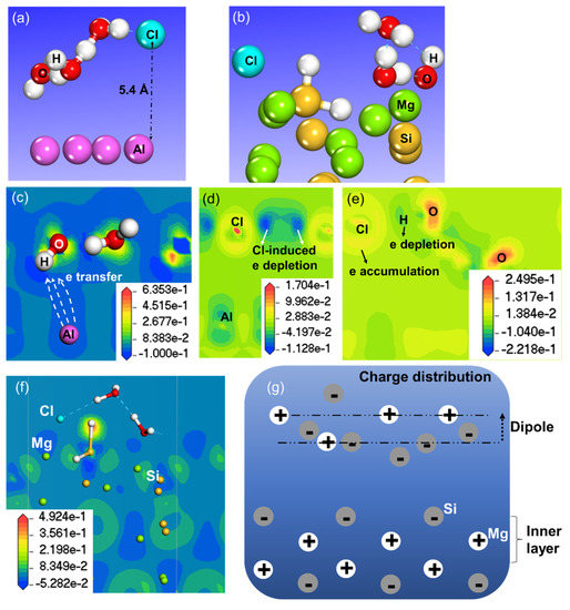 From Figure 7d it is seen, however, that slight electron density rearrangements occurred within surface Al, which could partly compensate for the work function change caused by the oxidation effect mentioned above [52]. Comparing the scale bars of Figure 7c,d, the work function increase by oxidation was dominant over that caused by rearrangements within the Al surface. Due to its strong electron affinity, Cl gained a concentrated electron density atop of it, while it created an electron depletion area around it, indicated by the color contrast in Figure 7d. However, direct electron transfer from Cl to Al was absent. By slicing another atomic plane (Figure 7e), Cl was demonstrated to gain electrons from an adjacent H2O, indicating a possible electronic interaction between these two species.