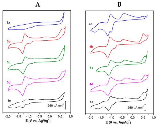 Cyclic voltammetry (CV) was performed in a conventional three-electrode electrochemical cell using a potentiostat/galvanostat (EG&G, PAR VersaStat 3). A polished glassy carbon disk electrode (GC) (0.07 cm2, BASi USA) was employed as working electrode. Prior to each experiment, the GC electrode was polished to mirror finishing with 0.3 mm and 0.05 mm alumina and washed with distilled water, and sonicated in ethanol for 5 min. The counter electrode was a Pt wire (Alfa-Aesar, USA), and a home-made Ag/Ag+ pseudo-reference electrode was used as a reference. The pseudo-reference electrode consisted of a silver wire in a body-glass (PINE research, USA) filled with a solution of 0.01 M silver nitrate (AgNO3, BASi, USA) in tetrabutylammonium tetrafluoroborate (TBABF4, Sigma Aldrich, USA) 0.1 M in dimethyl sulfoxide (DMSO, Sigma Aldrich, USA). The supporting electrolyte consisted of TBABF4 0.1 M dissolved in DMSO. As received TBABF4 and DMSO were used without further purification or drying processes. Furthermore, the testing solutions were prepared by adding compounds 3a–e or 4a–e to the supporting electrolyte for a final concentration of 5 × 10−3 M. Then, cyclic voltammetry (CV) was carried out in a range from −2.0 to 0.75 V vs. Ag/Ag+ at a scan rate of 100 mV s−1 in the cathodic direction to identify any electron transfer reaction. The redox reaction processes associated to compounds 3a–e or 4a–e were further studied by CV at a scan rate of 10, 25, 50, 100, 200, and 300 mV·s−1.