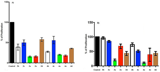 In Figure 2A,B, the CV profiles of the naphthoquinone derivative compounds mainly display one quasi-reversible redox reaction process as compared to the two reduction peaks of typical quinone derivatives in aprotic media [35,36]. Interestingly, compound 3a (Figure 2A) does not show any significant electroactive processes in the studied potential range. The irreversible reduction peak observed near to −0.8 V for 3b–e and −0.9 V for 4a–e in Figure 2A,B, respectively, are related to the oxidation reactions occurring by electron dislocations of the quinone derivatives at more positive potentials, >−0.7 V or >−0.5 V for both 1,4-naphthoquinone and 2,3-dichloro-1,4-naphtoquinone–amino acid derivatives, respectively. Additionally, the irreversible reduction–oxidation peaks were not observed when further cyclic voltammetry studies were performed at different scan rates in the cathodic potential region for the evaluation of the redox reactions.
