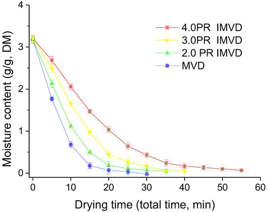 Figure 1 shows the dehydration curves of dried samples at different times using IMVD and MVD. Different pulse ratios (2PR, 3PR, and 4PR) were calculated according to Equation (1). Dehydration curves are characterized by different dehydration kinetics related to cost and quality [5,22]. These drying kinetics are determined by temperature, properties of materials, and vacuum stage [11,23]. In the beginning, the drying rate was higher and gradually dropped for 10–20 min. The drying rate became constant after reaching the maximum drying rate; among the samples, that at 4.0 PR IMVD reached the constant level earlier. The reason for this phenomenon is that with the large accumulated volume of heat vapor of bulk water was accelerated faster [15,22]. IMVD reduced total drying-on time than MVD, although tending-zero drying in IMVD took longer than MVD. This means that additional intermittent drying could further decrease energy consumption. From Figure 1, it is obvious that intervals (off-drying) decreased the drying time while increasing the drying rate in IMVD of litchi fruits. The minimum value of drying time (4.0 PR) was 30 min since increased mass transfer of vapor in the tempering period.