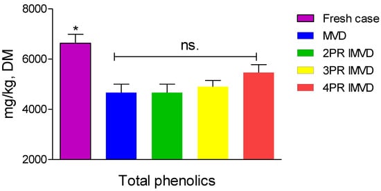 Figure 3 presents the phenolic contents of samples dried by IMVD and MVD, and their comparison with fresh litchi fruits. Total phenolic compounds of dried samples decreased significantly (p ≤ 0.05) compared with the fresh sample. Results showed that interval volume heating in IMVD led to a higher amount of total phenolic compounds than MVD. In this sense, lower temperature and less time that implies less exposure to oxygen accounted for higher phenolic content. There was an average retention of 70–75% phenolic compounds in IMVD and MVD. There were no differences in phenolic contents of samples dried by the four drying methods. This might be caused to some extent by reducing sugar protected from oxidation [23,24,25].