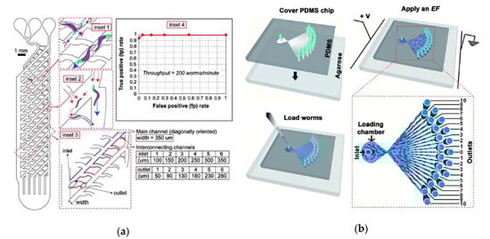 - Liu, D.; Gupta, B.; Selvaganapathy, P.R. An automated microfluidic system for screening Caenorhabditis elegans behaviors using electrotaxis. Biomicrofluidics 2016, 10, 014117. [Google Scholar] [CrossRef]
