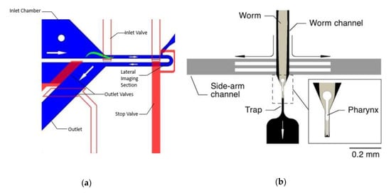 - Chung, K.; Crane, M.M.; Lu, H. Automated on-chip rapid microscopy, phenotyping and sorting of C. elegans. Nat. Methods 2008, 5, 637–643. [Google Scholar] [CrossRef]
