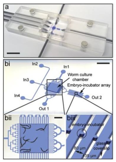 High-resolution imaging of embryo populations is necessary to study cellular origin and gene expression patterns. A device was developed by Cornaglia et al. (2015) for long-term, high resolution imaging of embryos acquired from a population of adult worms grown on-chip (Figure 4a). This device relies on passive hydrodynamics, meaning that no on-chip valves or other active components are required [46]. The device consists of two chambers: one for on-chip culture of a stock population of adult worms used to generate the embryos for study and an embryo-incubating chamber for the culture and study of embryos (Figure 4bi–iii). E. coli are delivered to the device through a filter leading into the worm culture chamber. Another filter is used to transfer embryos from the main culture chamber to the embryo-incubating chamber. Individual embryos flow through the filter channels and are hydrodynamically trapped in individual micro-incubators. The flow through the channels was designed to produce stable incubation of all embryos, without any shifting or motion due to unbalanced flow. Once the embryos are in the incubator, they are imaged throughout their development time and in three dimensions. This platform can be used to perform chemical and RNAi screens for larval development through exposure of the parents, or by screening for chemicals which are absorbed by the embryos. However, multiple platforms would need to be operated in parallel to screen for multiple chemicals.