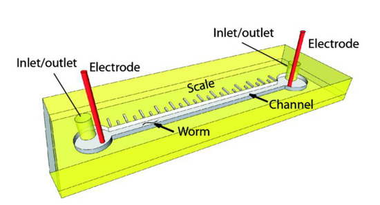 Microfluidic device for determining neuronal function by measuring electrotactic behavior. Scale quantitatively measures worm position between two electrodes [59]. Reproduced with permission from Salam et al., Worm, Taylor and Francis Online, 2013.