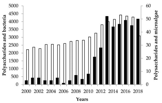 Polysaccharides which are the most abundant carbohydrates in nature are high molecular weight biopolymers (10 to 1000 kDa) with complex structures and various physico-chemical properties. They are mainly composed of pentoses and/or hexoses linked by glycosidic bonds leading to linear or ramified homo- and heteropolymers. Depending on the nature of monosaccharides, kinds of glycosidic bonds, presence of some non-sugar constituents (sulfates, organic acid, methyl, amino acids, or amine), they are rigid or flexible macromolecules with various levels of solubility in water. The monosaccharides which are most commonly present in their structures are d-xylose, d-glucose, d-galactose, and d-mannose and some corresponding N-acetylaminosugars and uronic acids. Compared to polysaccharides from terrestrial plants, fungi and macroalgae, eukariotic and prokariotic microbial polysaccharides have probably the higher structural diversity [1,2,3]. These microbial polysaccharides have various biological functions. They can be energetic reserve (starch or glycogen), structural components serving structural and protective purposes (β-glucans or peptidoglycan) or excreted outside the cells to form (or not) mucilaginous layers with not well-defined functions. Indeed, some of the roles ascribed to these exocellular microbial polysaccharides also called exopolysaccharides (EPS) are protective barrier, sorption of organic and/or inorganic compounds, binding of enzymes, sink for excess energy, adhesion, biofilm, protection from antimicrobial agents including predators, exportation of cell components, water retention bacteria aggregation, and nutrient source for a bacterial community [3]. The marine and freshwater environments harbor the main part of the microbial biomass on Earth. Among this microbial biomass, microbial photoautotrophs including microalgae and cyanobacteria have been poorly investigated to produce metabolites such as EPS despite their potential. Indeed, the number of microalgae and cyanobacteria species has been estimated to about 800,000 species. Among them only 50,000 have been identified [4,5,6], and less than 100 have been described to produce EPS [2]. These EPS producers are mainly Cyanobacteria rather than eukaryotic microalgae [2,7]. This number is very low compared to of bacteria producing EPS (Figure 1). Note that in the last decade, the number of references on EPS in microalgae are equal to that on bacteria, suggesting that microalgae producing EPS are not so overlooked.