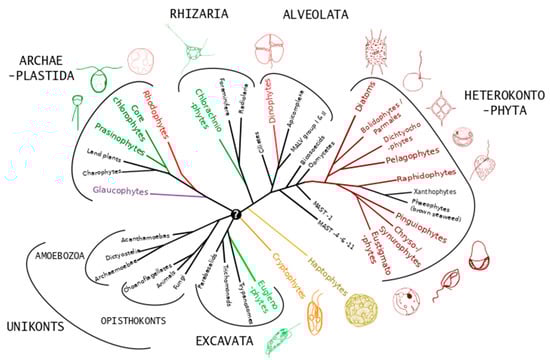 Schematic phylogenetic tree representing the distribution of microalgae (colored lineages with representative images) across major eukaryote supergroups. Adapted with permission from Not et al., Advances in Botanical Research, 64, 1–53; published by Elsevier, 2012 [17].