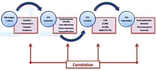 In the microalgae world, three main levers enable to put new active ingredients such as EPS on the market [67]. The recent industrial feasibility of EPS production is based on the strain selection, the choice of the adapted photobioreactor, and the strict control of the downstream process. For each EPS and each application [62], food including nutraceutical, cosmetic, and pharmaceutical, these three levels must be studied and adjusted to meet specific regulatory obligations and make profits.
