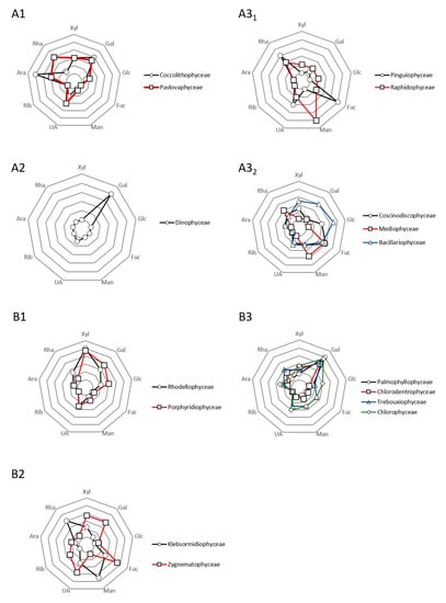 Schematic trends of EPS structural features for various microalgae phyla described in the literature over the last decades. The mappings were compiled according to the data published by [7,8], by attributing 0 to 5 averaged points, regarding the richness of each monosaccharide. A1, A2, and A31,2 respectively correspond to Haptophytra, Myozozoa, and Ochrophyta. B1, B2, and B3 respectively correspond to Rhodophyta, Charophyta, and Chlorophyta.