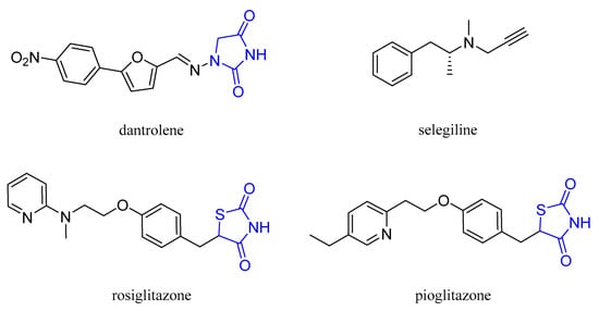 The multifactorial nature of AD and the absence of an effective and long-lasting therapy so far, have stimulated medicinal chemists to follow multitarget drug design strategies based even on repositioning of approved drugs [17]. A recent example is represented by the antidiabetic drugs rosiglitazone and pioglitazone, as seen in Figure 1, isosteric analogues of hydantoins [18] that competitively inhibit MAO B with a low- and submicromolar Ki value, respectively, for the human enzyme. The high specificity shown by pioglitazone, and the crystallographic data in support of it [19], justify the possible repositioning of these molecules among promising neuroprotective agents.