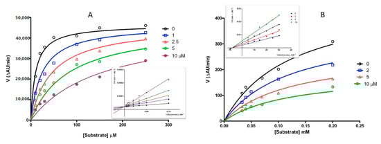 Michaelis–Menten curves of inhibition kinetics of dantrolene: (A) hMAO B (substrate: kynuramine); (B) hAChE (substrate: acetylthiocoline). Insets: Lineweaver–Burk plots. Figures represent a single experiment.