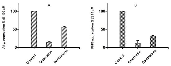 Inhibition of self-aggregation of Aβ40 30 μM (A) and PHF6 50 μM (B) by dantrolene and the reference inhibitor, quercetin.