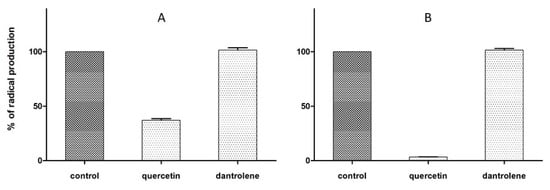 Antioxidant effects of dantrolene and the reference, quercetin, in scavenging of 100 μM DPPH (A) and ABTS (B) radical species. Values are mean ± SD for compounds at a concentration of 50 μM (DPPH assay) or 0.2·[ABTS+].