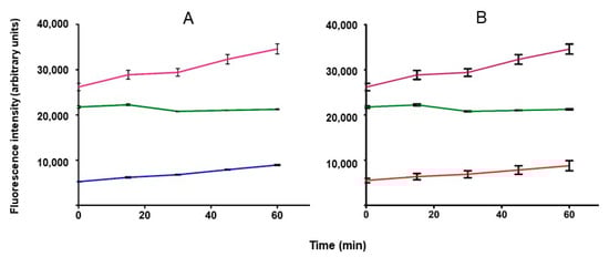Already published protocols for DPPH and ORAC radical scavenging were used [38,53]. The scavenging of the radical DPPH·, or the monocation radical ABTS·+, were determined by measuring the loss of absorbance at 515 or 755 nm, respectively. Samples were prepared in clear polystyrene flat-bottomed 96-well microplates. Briefly, for the DPPH assay, to 35 μL of test sample solutions (or vehicle for controls: ethanol containing 5% DMSO), 215 μL of ethanol solution of DPPH were added. The final concentrations of DPPH· and inhibitors were 100 μM and 50 μM, respectively. To form ABTS·+, a 10 μM ABTS water solution was added to 8.2 mM potassium persulfate in water (ratio 7/3); this solution was stored to darkness for at least 16 h, then diluted 60-fold with ethanol immediately before use. A preliminary absorbance reading at 755 nm allowed to determine the actual ABTS·+ concentration (normally 60–70 μM; extinction coefficient ε = 12,000) and set the final concentration of inhibitors to 0.2[ABTS·+]. 215 μL of ABTS·+ solution were mixed with 35 μL of stock solution of inhibitors and the decrease in absorbance was monitored. Antioxidant activity was determined from Equation (2) as the percentage of radical production of inhibitor containing samples, compared with control: