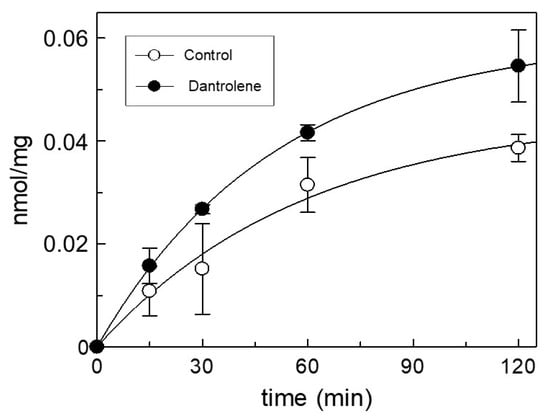 Time course of [3H]-carnitine uptake within intact mitochondria. The plot displays the curves of control and treated mitochondria by 50 μM dantrolene sodium. The data represent means ± SD of at least three independent experiments.