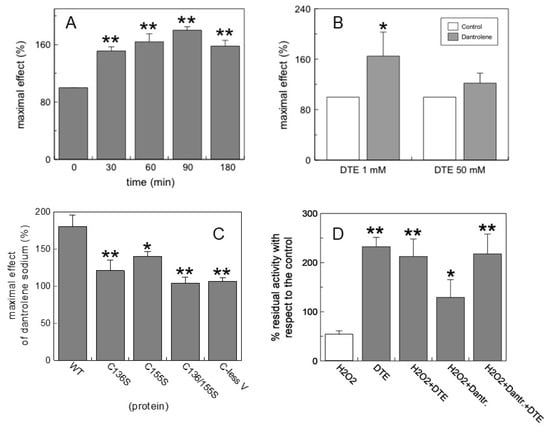- Aracena-Parks, P.; Goonasekera, S.A.; Gilman, C.P.; Dirksen, R.T.; Cecilia Hidalgo, C.; Hamilton, S.L. Identification of cysteines involved in S-nitrosylation, S-glutathionylation, and oxidation to disulfides in ryanodine receptor type 1. J. Biol. Chem. 2006, 281, 40354–40368. [Google Scholar] [CrossRef]