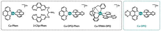 In recent years, we have focused on introducing modifications to the Cu-Phen scaffold to enhance DNA recognition, oxidative damage and cytotoxicity [11]. Approaches including inner sphere modifications using coordinated carboxylate groups [13]; dicarboxylate groups (e.g., o-phthalate or octanedioate) [26,27,28,29,30,31]; designer phenazine intercalators [32,33]; tris-(2-pyridylmethyl)amine (TPMA) caging ligands [34,35]; and the introduction of a binuclear di-cation have been undertaken [26,30,36]. Previously, we reported a series of phenazine-functionalized Cu(II) phenanthroline complexes—with general formula [Cu(N,N′)(Phen)]2+ (where N,N′ = dipyridoquinoxaline (DPQ) or dipyridophenazine (DPPZ))—that offered a significant enhancement of DNA binding affinity relative to Cu–Phen [32]. A microfluidic “on-chip”-based method identified Cu-DPQ-Phen as the most active chemical nuclease in the series and later, the hydroxyl radical was identified as the predominant species responsible for the oxidative cleavage event [33]. We also probed the chemical nuclease efficacy on restricted plasmids with varying GC content. Significant differences were noted in the chemical nuclease efficacy of the Cu-N,N′-Phen complex series compared to Cu-Phen. Cu-Phen displayed higher chemical nuclease activity on pUC19 (51% GC), while each of the Cu-N,N′-Phen complexes had enhanced activity on the pBC4 plasmid (59% GC), leading us to hypothesise that this general class of compound may oxidatively target cytosine–phosphate–guanine (CpG) islands.