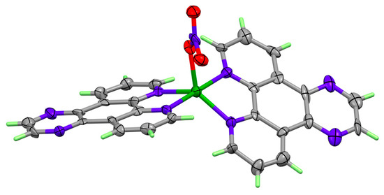 X-ray structure of one of the two independent [Cu(DPQ)2NO3]+ cations showing 50% probability ellipsoids (colour scheme: copper, green; nitrogen, purple; carbon, grey; and oxygen, red).