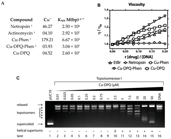 (A) Apparent DNA binding constants (Kapp) of Cu-DPQ to EtBr-saturated solutions of dsDNA (* C50 = concentration required to reduce fluorescence by 50%; ** Kapp = Ke × 12.6/C50 where Ke = 9.5 × 106 M(bp)−1; † previously reported). (B) Relative changes in viscosity profiles of stDNA in the presence of Cu-DPQ, Cu-DPQ-Phen, Cu-Phen, netropsin and EtBr-treated salmon testes dsDNA. (C) Topoisomerase-I-mediated DNA relaxation assay.