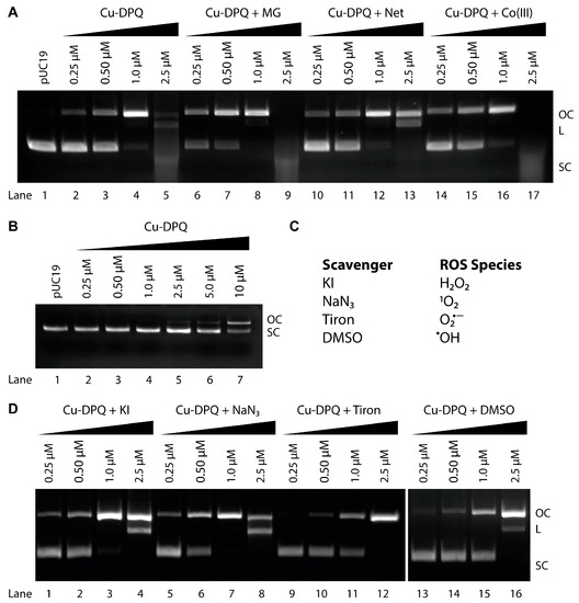 The cleavage efficiency of Cu-DPQ was monitored by agarose gel electrophoresis over a narrow concentration range of 0.25 µM, 0.50 µM, 1.0 µM, and 2.5 µM (Figure 4A, lanes 2–5). Cu-DPQ was initially reduced to the active Cu(I) state with 1 mM exogenous reductant (Na-L-ascorbate) prior to the introduction of plasmid DNA. Cu-DPQ showed concentration-dependent relaxation of SC to OC with almost complete degradation upon treatment with 2.5 µM of the complex. The cleavage efficiency of Cu-DPQ on pUC19 is greater than Cu-DPQ-Phen and Cu-Phen complexes, illustrating the influence of the bis-ligated DPQ ligand on oxidative DNA damage [33]. Interestingly, in the absence of reductant, Cu-DPQ is capable of ‘self-activation’ since the emergence of OC DNA is visible in the presence of 2.5 µM of this complex with higher concentrations emerging at 10 µM (Figure 4B, lane 7).