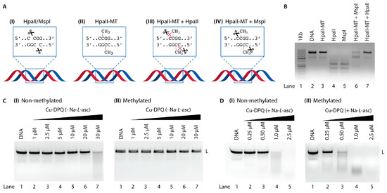 (A) Cartoon representation of enzyme restriction sites. (B) Control experiment with isoschizomers HpaII and MspI in the presence and absence of HpaII-MT. (C) A quantity of 400 ng of 798 bp linear sequence (I non-methylated and II methylated) treated with Cu-DPQ in the absence of reductant. (D) 400 ng of 798 bp linear sequence (I non-methylated and II methylated) treated with Cu-DPQ in the presence of reductant Na-L-asc.