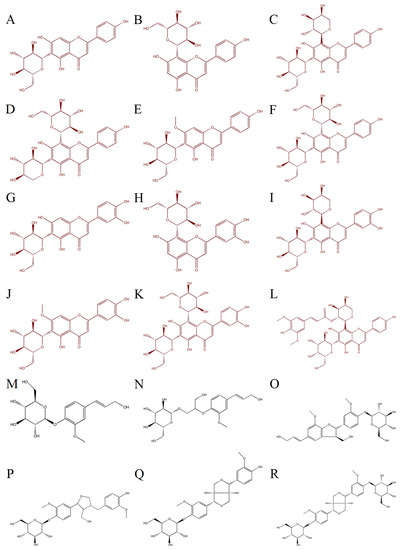 Structures of compounds profiled in flax leaves by LC-MS. (A) Isovitexin, (B) Vitexin, (C) Schaftoside, (D) Vicenin-1, (E) Swertisin, (F) Vicenin-2, (G) Isoorientin, (H) Orientin, (I) Carlinoside, (J) Swertiajaponin, (K) Lucenin-2, (L) Triticuside A, (M) Coniferin, (N) 3-Hydroxy-2-[4-[(1E)-3-hydroxy-1-propen-1-yl]-2-methoxyphenoxy]propyl β-d-glucoside (HHMPG), (O) Dehydro- diconiferyl alcohol-4-O-glucoside (DCG), (P) Lariciresinol-4-O-glucoside (LMG), (Q) Pinoresinol-4-O-glucoside (PMG), (R) Pinoresinol diglucoside (PDG).